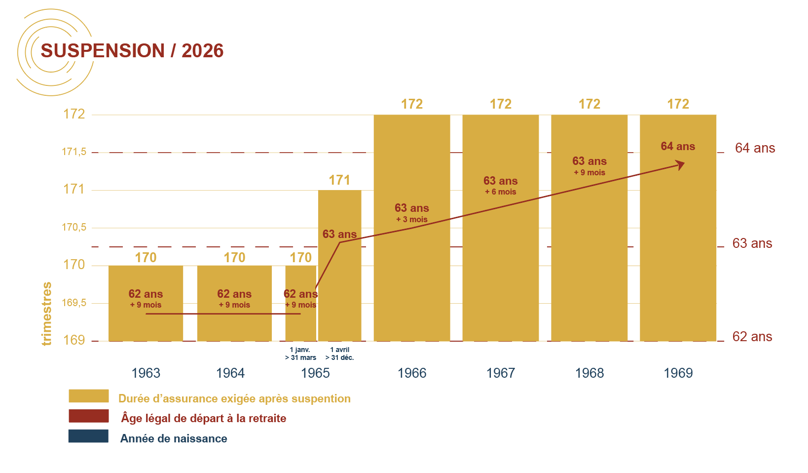Et plus remarquable est l’iniquité de cette suspension : chaque assuré n’est pas impacté de la même manière par cette suspension, selon son année et même son mois de naissance : +6 mois de gagné pour les assurés nés au 1er trimestre 1964 contre 3 mois seulement pour ceux nés après la même année ! De même, on peut relever que seules les générations de 1964 et 1965 bénéficient de la réduction d’un ou 2 trimestres nécessaires pour le taux plein, alors que toutes les générations suivantes doivent toujours atteindre 172 trimestres pour faire valoir leurs droits à taux plein.